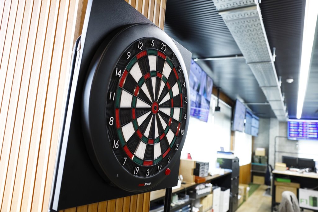 天井は美術館の屋根などに使われる高級ガリバリウム鋼板、壁は石板。モノトーンの空間に、遊び心たっぷりのカラフルなグッズ。マジンガーZ、ダーツ、ヤノベケンジ、ミャクミャク等、さまざまなキャラクターが遊び心を添える。