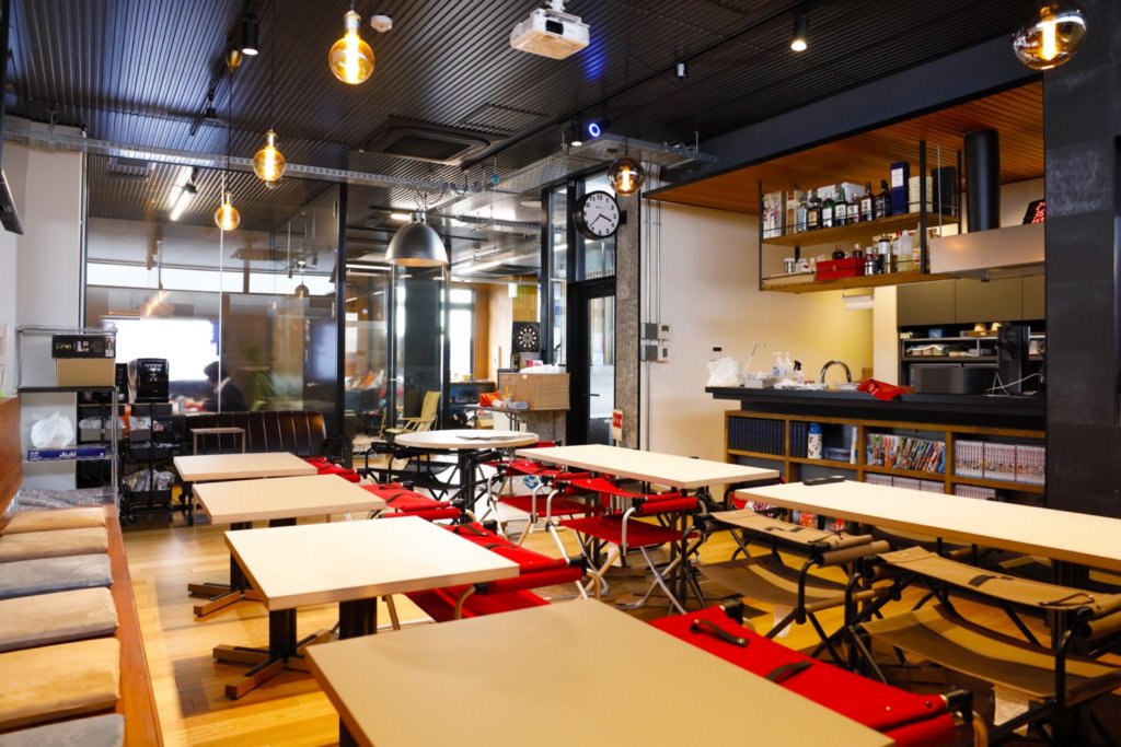 食堂兼会議室に30席ほど並ぶ椅子の、おしゃれなレッドカラーも印象的だ。移動させやすい折りたたみ式のキャンプ用品という。照明は温かみのあるランプ。壁に会議用のスクリーンが2つ。隣室は大型テレビのある休憩室、空を見ながらデッキチェアでくつろげるベランダも。随所に亥子さんの哲学が見え隠れする。