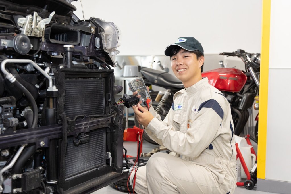 作り手によって異なる、いろいろなメーカーの車を広く学びたいと入学。企業の方の講演や、各メーカーの車で実習できるのがおもしろいです。いま配線を学んでいますが、教科書だけでは難しいことも、実車で測定し、値を見ることで理解が深まります。正確な値が出た時はうれしいです。将来は実家に入るかメーカー就職かで迷っていますが、今回お会いした先輩方のお話を参考に、視野の広い、整備士になりたいです。